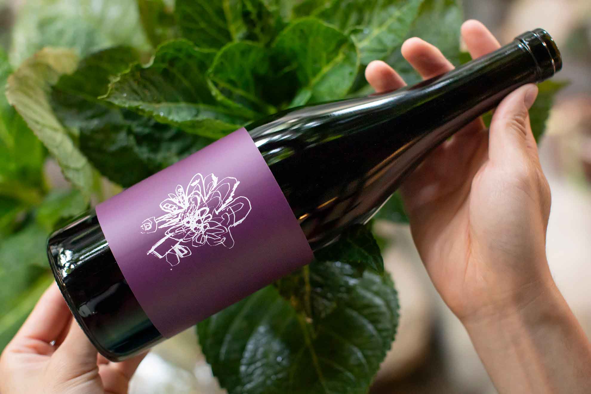 小学校からの帰り道のことでした。道べりに咲いていた紫陽花の美しさに目を奪われて、思わず立ち止まり、手を伸ばしたことがあります。そこで持ち帰ったひと枝は、私が初めて挿し木をしたものであり、今でも自宅で脈々と生命を繋ぎつづけ、梅雨の季節になると満開の花を咲かせます。このワインもまた、あの日の紫陽花のように、心をゆらす存在で在り続けたいという願いを込めています。折しも、娘が描いた絵が紫陽花を彷彿とさせる仕上がりとなりました。彼女が成長して大人になったとき、子どもの頃の自分が描いたその花が、いつまでも咲き誇っていられるように、GRAPE SHIPを象徴するワインとして、これからもつくり続けていきたいという想いも込めています。