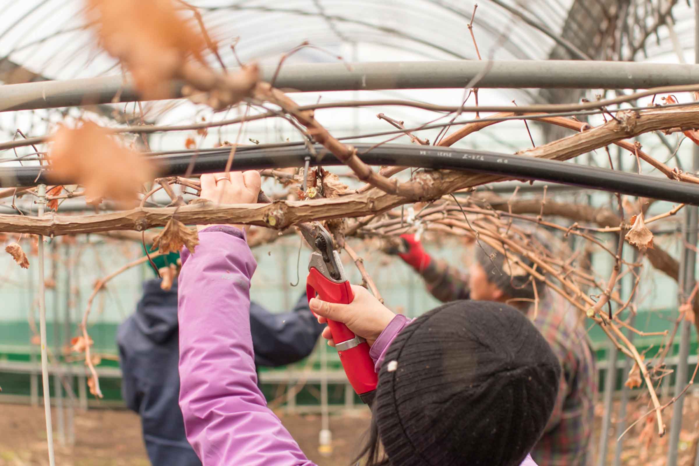 アートスペース油亀の柏戸さんとの出会いは 2016 年。油亀の特別プロジェクト「果実の灰でうつわを作る」の前身となった「桃灰作器」に、私の妻が遊びにでかけたのがきっかけでした。桃の灰から生まれた作品が、一堂に会している様を目の当たりした彼女は、自分たちが栽培するぶどうの灰からも、うつわが作れるものなのかと、興味津々で展覧会を満喫。これがきっかけとなり、柏戸さんは折に触れて農園に来てくれるようになりました。剪定作業を体験、切りおとした枝を燃やす場に立ち会い、その灰を持ち帰り、全国の陶芸家の方々に届けるようになったのです。